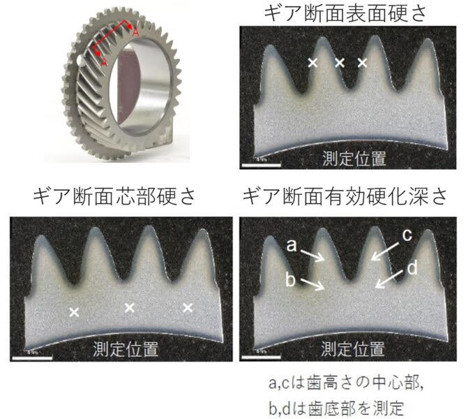 Cutting the gears during development, we analyzed surface and core hardness of the gears, studying the effective hardness layers as well as its material composition.